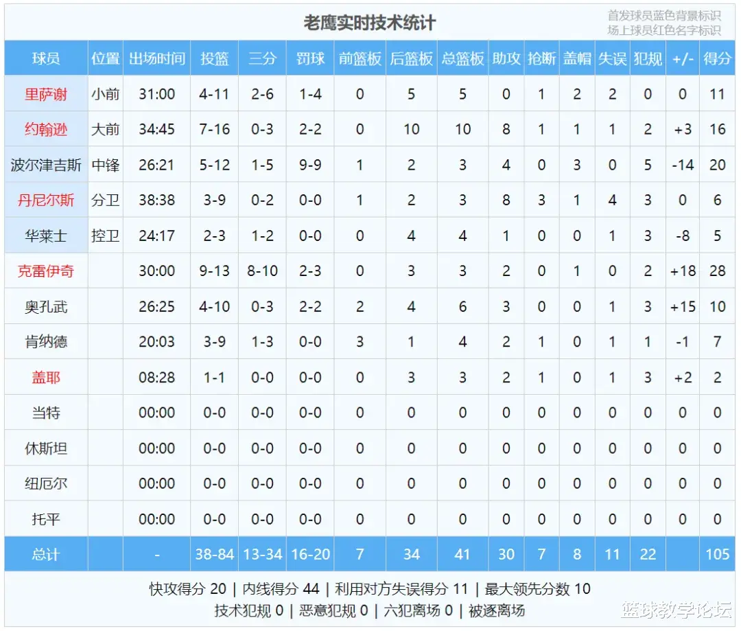The Clippers' bench scored only 23 points in total, and the Eagles' bench players scored 47 points in total. Hawks player Krejic played 30 minutes as a substitute, making 9 of 13 shots, 8 of 10 three-pointers, 2 of 3 free throws, scoring 28 points, 3 rebounds, 2 assists and 1 block, with a game-high plus-minus of +18. Krejic was born on June 19, 2000, the 37th pick in the 2020 draft.