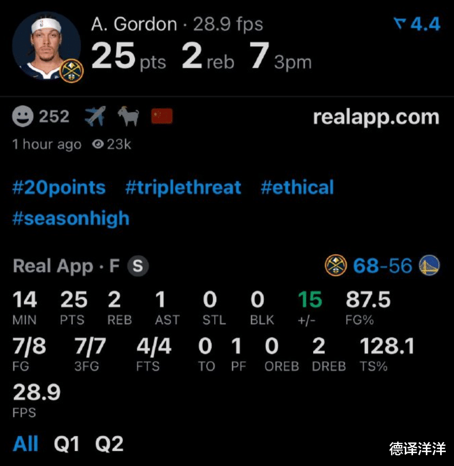 Facing the Warriors' frontcourt in this game, Gordon fully demonstrated his athletic ability and shooting skills. Throughout the first half, Gordon played like crazy. He made 7 of 7 shots from beyond the three-point line and was simply unstoppable. The Warriors also tried their best to hold on to the score, but Gordon's offensive firepower was so fierce that Jokic didn't even need to take action.