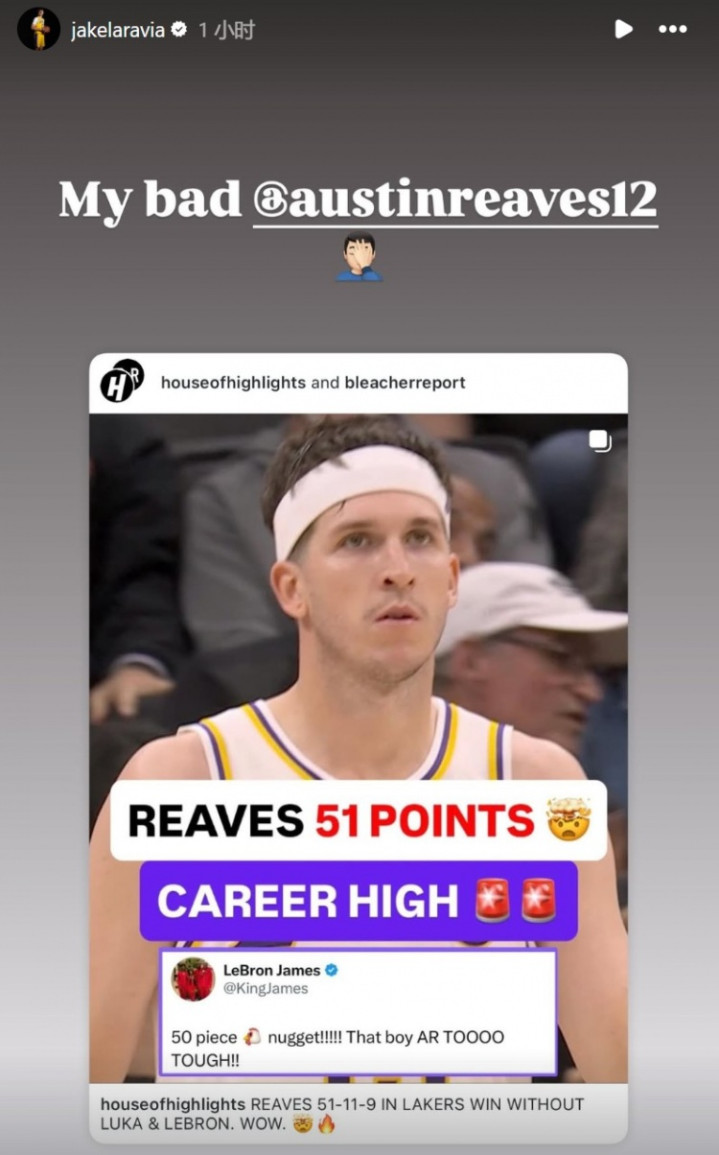 At the last moment of the game, Laravia was blocked on a fast break, preventing Reeves from scoring a 50-point triple-double. In response, he forwarded Reeves' data on INS after the game and wrote: "My bad @Reeves♂."