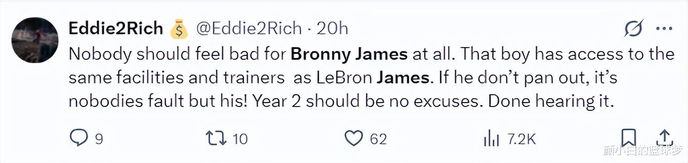 It's a pity that the US media Eddie2Rich did not buy it. He criticized after the game: No one should have spoken for Brownie James. That child uses the same resources as LeBron James, training equipment and trainers. If Brownie fails to succeed, you can only blame yourself for not working hard enough! The second year is, stop making excuses, we have heard enough.