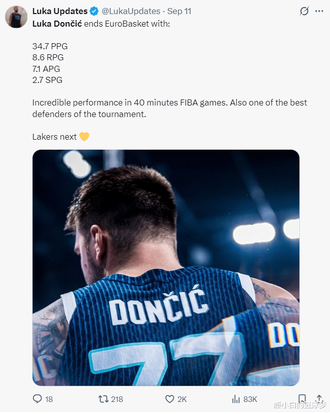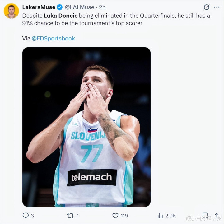 Lakers media wrote: Although Doncic missed the semi-finals and finals, according to the data media's predictions, he still has a 91% chance of winning the scoring champion of this European Cup.