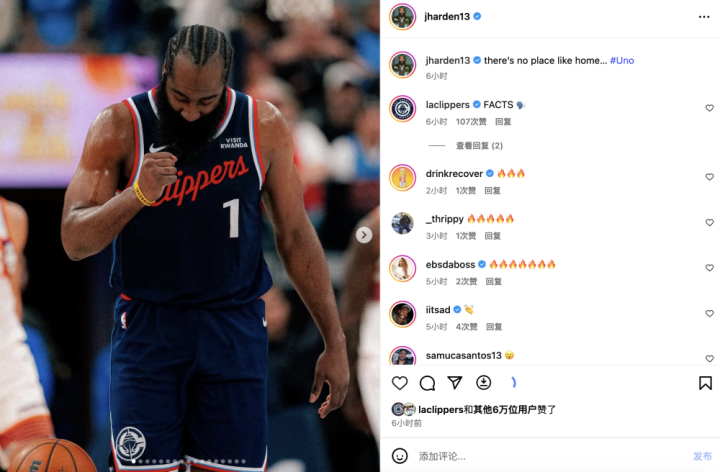Earlier today, Harden updated his social media to post photos of yesterday's game and wrote: "The feeling at home is unparalleled!" Interestingly, when talking about the energy brought to the team by the home fans, Harden joked: "This billion-dollar arena built by Ballmer is our home court advantage. It should be more than this number. In short, this is Our home is just a very expensive home."