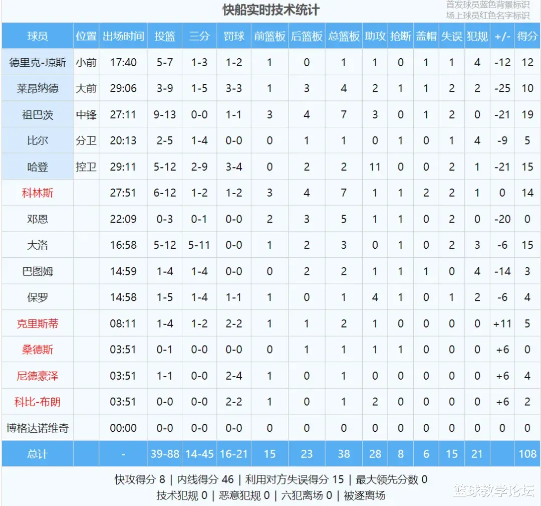 Let’s take a look at the performance of several Clippers new players: Collins played 27 minutes and 51 seconds off the bench, making 6 of 12 shots, 1 of 2 three-pointers, 1 of 2 free throws, 14 points, 7 rebounds, 1 assist, 1 steal, 1 block, and 2 turnovers, with a plus-minus of 0; Bill started for 20 minutes, shot 2 of 5, 1 of 4 three-pointers, and only scored 5 points, 1 rebound, 1 steal, and 4 fouls, with a plus-minus of -9.