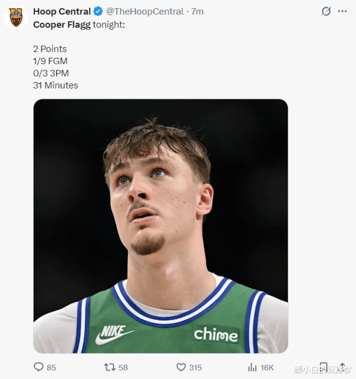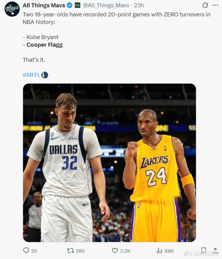 This is the Mavericks' second back-to-back game. In the last game against the Raptors, Flagg scored 22 points, 4 rebounds and 4 assists, matching Kobe. He is the second 18-year-old player after Kobe to have 20+0 turnovers.