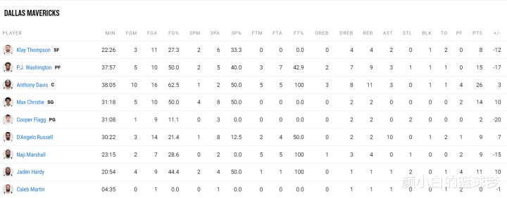 In this game, the core of the Mavericks, Big Eyebrow, scored 10 of 16 three-pointers and 1 of 2 three-pointers for 26 points, 11 rebounds and 1 block in 38 minutes. However, only Washington and Christie were in good condition beside him. Klay was 3 of 11, Russell was 3 of 14, Flagg was 1 of 9, and Marshall was 2 of 7.