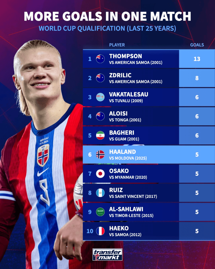 Single World Cup qualifiers: Oceania players have won the top 4, Haaland tied for 6th with 5 goals