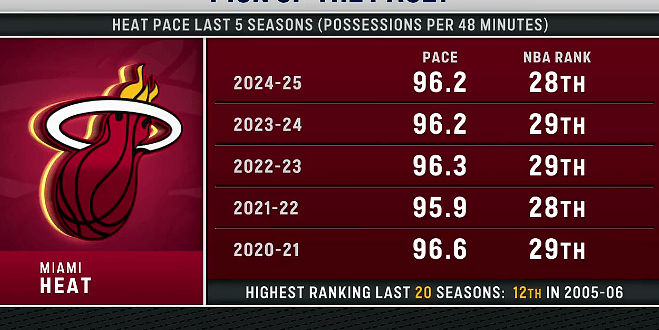 Slow-paced team! The Heat have ranked last in the league in average possessions per game in the past five seasons.
