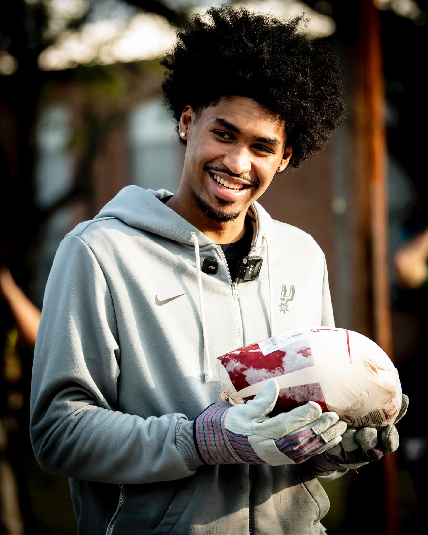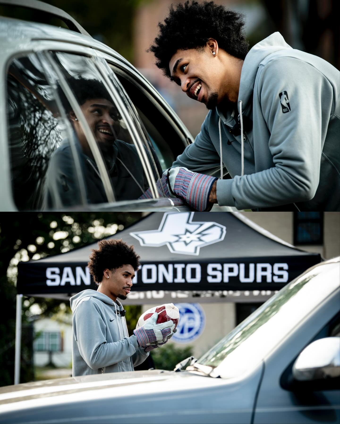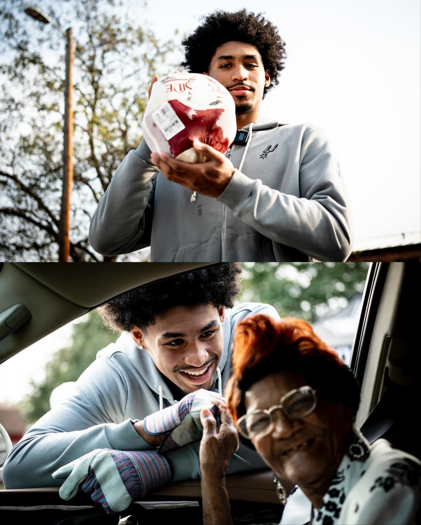 Spurs ins reported that team member Dylan Harp cooperated with H-E-B supermarket yesterday to deliver holiday cheer to community families in a turkey giveaway event