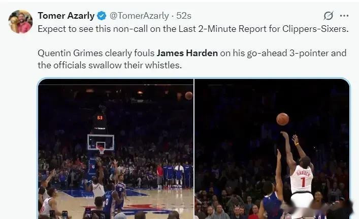 After losing to the 76ers, the Clippers seemed to have lost their direction. According to NBA statistics, in the past 9 games, the Clippers only achieved a record of 1 win and 8 losses. Although many major rotation players such as Jones Jr., Leonard and Bill are absent, the deep lineup depth will not hand over such a bad report card. There must be an ulterior secret in it. According to Clippers reporter Tomer Azarly: At the critical moment of chasing points at the end of the game, Harden did miss two three-point opportunities. However, as for the first three-pointer, it was clear from the replay provided by the dynamic photographer that the defensive player Grimes directly elbowed Harden. This behavior was obviously suspected of fouling. According to the rules, the referee should have sentenced Harden to go to the free throw line to execute the free throw, but the referee on duty did not make any penalty.