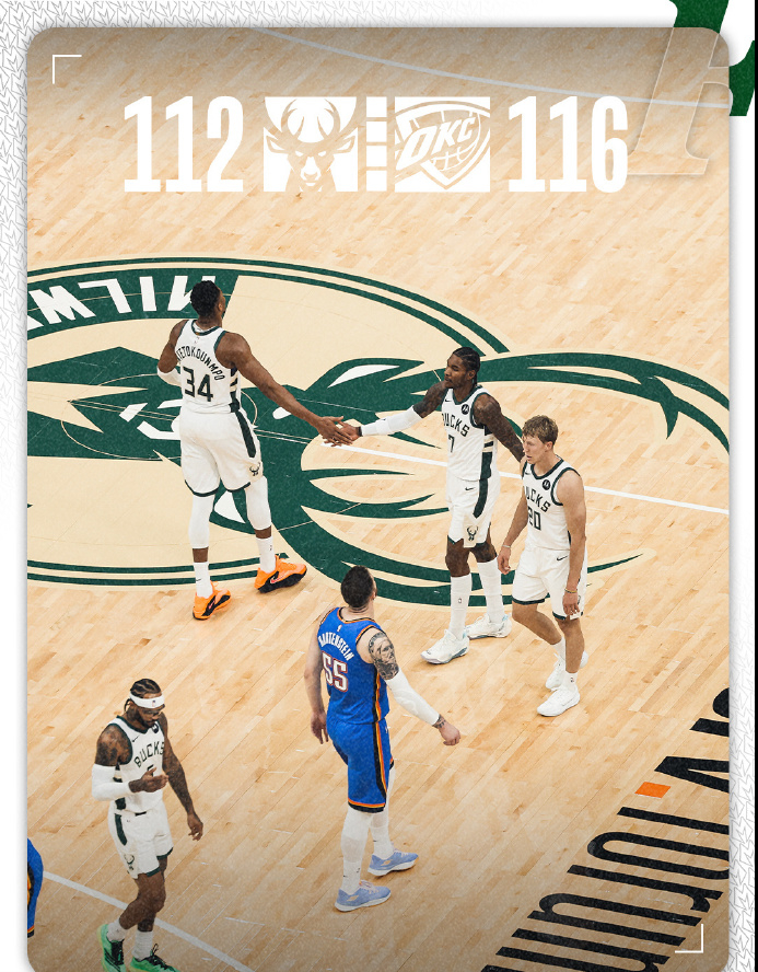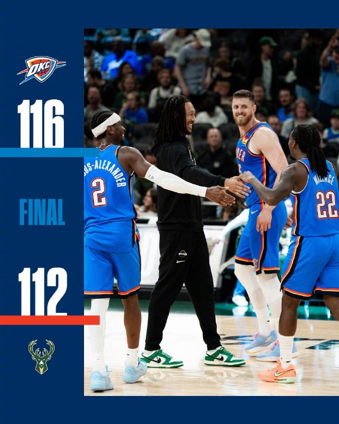 The Thunder narrowly defeated the Bucks 116-112 in the preseason today, bringing their preseason record to 3 wins and 2 losses. However, the Bucks' 3-game winning streak was ended and their record became 3 wins and 1 loss. It is worth mentioning that the Thunder and Bucks both reached the mid-season finals last season, but the Thunder lost to the Bucks and failed to win the mid-season championship.