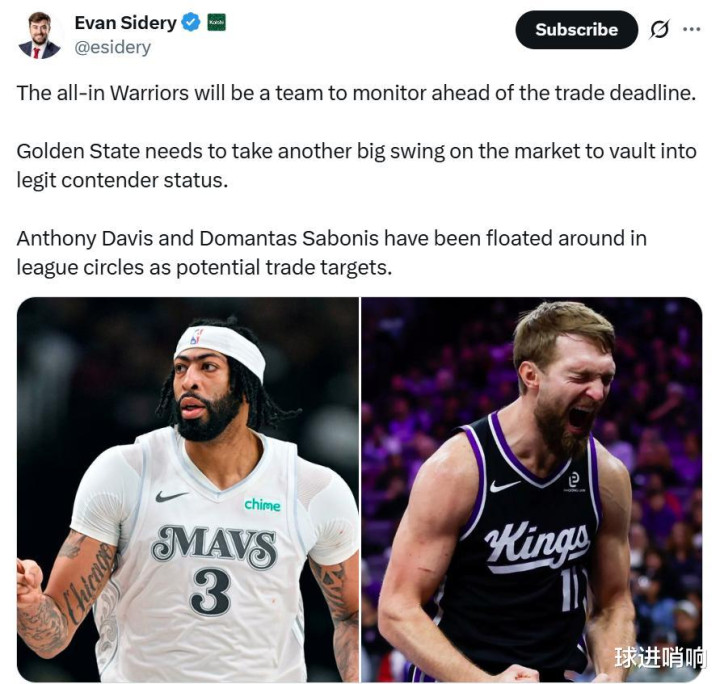 According to the famous reporter Evan Sidery, the Warriors are one of the most noteworthy teams before this season's trade deadline. They are planning a big deal to launch an all-out attack on the championship.