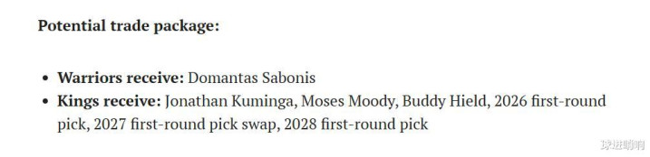 For this reason, the US media "SI" gave the Warriors a 6-for-1 trade tip, believing that the Warriors can package Kuminga and Moody to pursue Sabonis to create Curry + Sabonis + Butler + The four giants chasing dreams, the specific transaction content is as follows:
