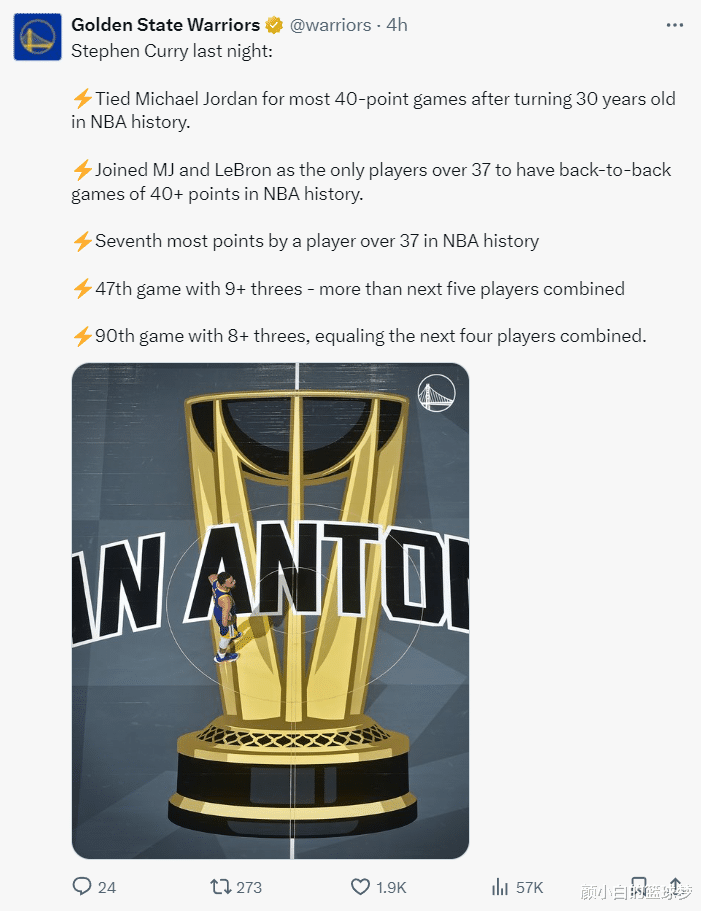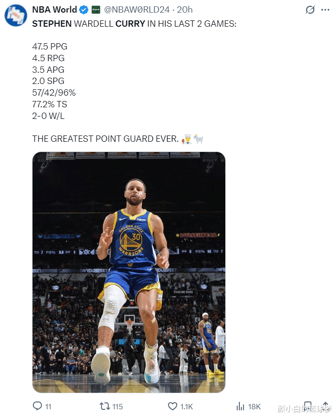In the last two games against the Spurs, Curry averaged 47.5 points, 4.5 rebounds, 3.5 assists and 2 steals per game, with a shooting percentage of 57%, a three-point shooting percentage of 42%, a free throw percentage of 96%, and a true shooting percentage of 77.2%. US media NBA World: Curry is the greatest point guard in history, the GOAT.