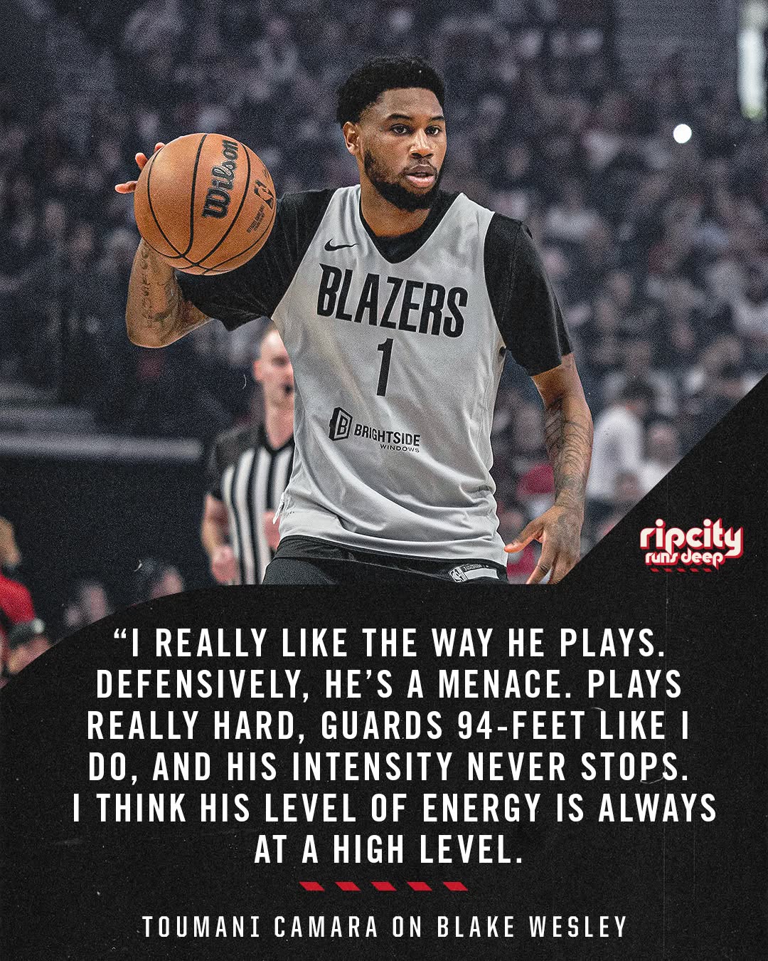 The Trail Blazers posted on Instagram that University of Texas rookie Blake Wesley is known for his high-intensity energy and defensive concentration in training. @toomanybucketss shared a highlight of @theblakewesley’s training with the caption, “His intensity never stops❗.”