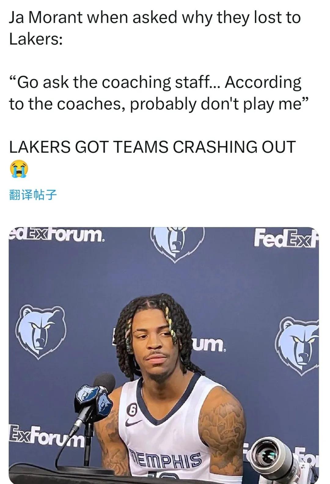 Grizzlies star Morant was very frustrated. He only made 3 of 14 shots and scored 8 points and 7 assists. When asked about relevant questions after the game, he said without politeness, "If you have any questions, ask the coaching staff, they don't want me to play." He also made it clear that he was in good health.