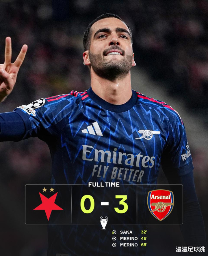 In the 68th minute, Slavia goalkeeper Markovic made a low-level error and the ball was directly intercepted by Merino. The latter pushed the shot into the empty goal and Arsenal led 3-0; Merino Mei After the second kick, the Gunners basically sealed the victory, and the final score was fixed here. The Gunners' winner in this game set several major records: