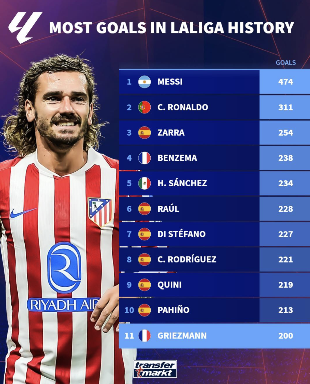 La Liga historical scorer list: Melo leads the top two; Griezmann ranks 11th with 200 goals