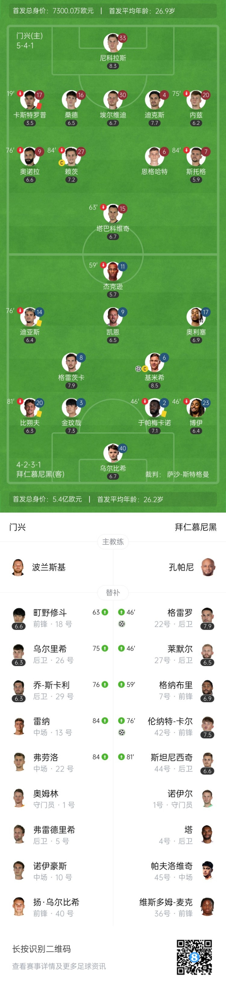 October 25th 21:45, Bundesliga 8th round Monchengladbach vs Bayern Munich. In the first half, Dias missed a single goal in the opening game; Castrop's tackle on Dias was red; Upamecano's outrageous handball was yellow! In the second half, Kane's goal was invalid due to offside, and then Kimmich and Guerrero scored; Bischoff sent a point, and Storg hit the post! 17-year-old Karl came on as a substitute to seal the victory! In the end, Bayern defeated ten-man Borussia Monchengladbach 3-0 and led the Bundesliga with 8 consecutive victories! Borussia Mönchengladbach continues to be at the bottom without a win in 8 games.