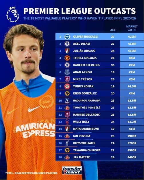 List of players who have not played in the Premier League this season: Boscali ranks first with 20 million euros, followed by Disasi