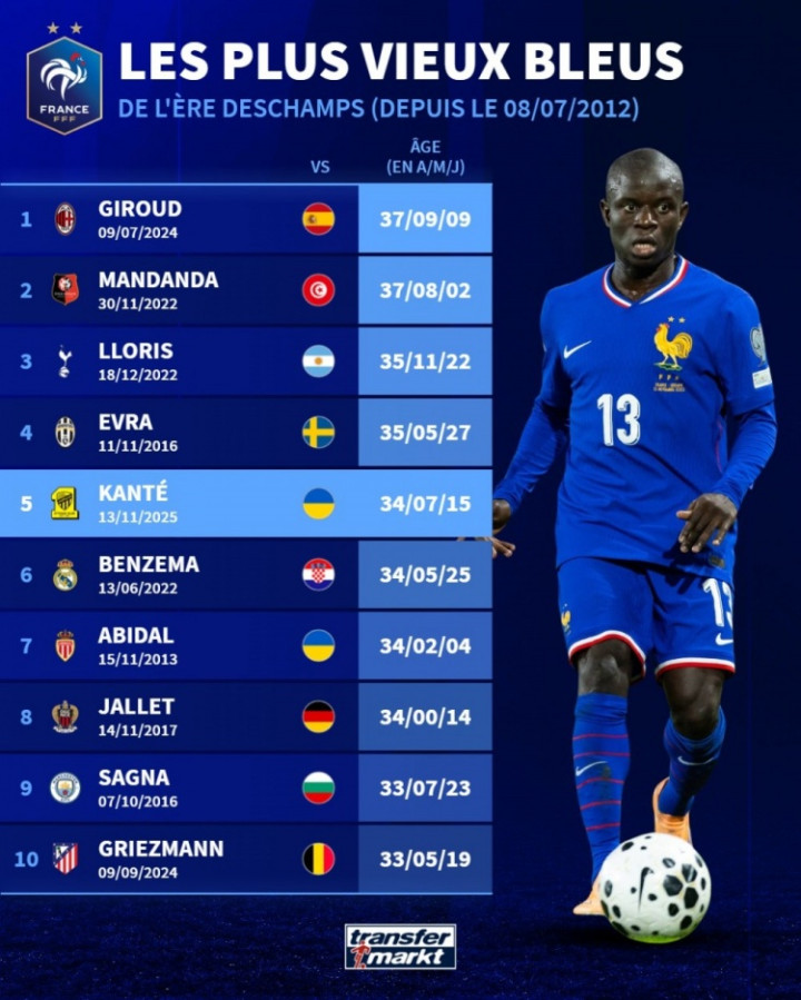 List of the oldest players to play for the French team under Deschamps: Giroud leads the list at 37 years old, Kante is fifth at 34 years old