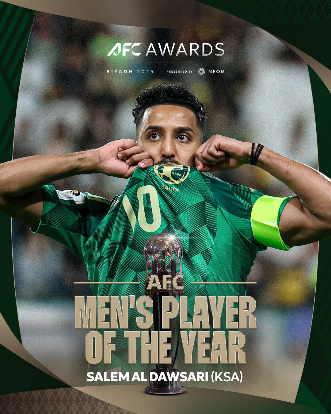 He also became the first Saudi player to win the award twice, and the fourth player in history to do so. The first three were Japan's Hidetoshi Nakata (1997, 1998), Uzbekistan's Deparov (2008, 2011) and Qatar's Afif (2019, 2023).