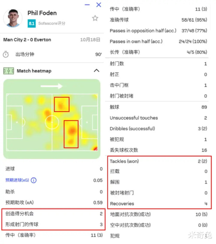 Compared with Haaland's explosive statistics, Foden's goals and assists are not conspicuous, but his role this season is very important. Take the last round of the Premier League match with Everton as an example. Although he did not receive any assists, Foden sent 3 key passes, created 2 excellent scoring opportunities, and succeeded in 2 of 3 dribble attempts.