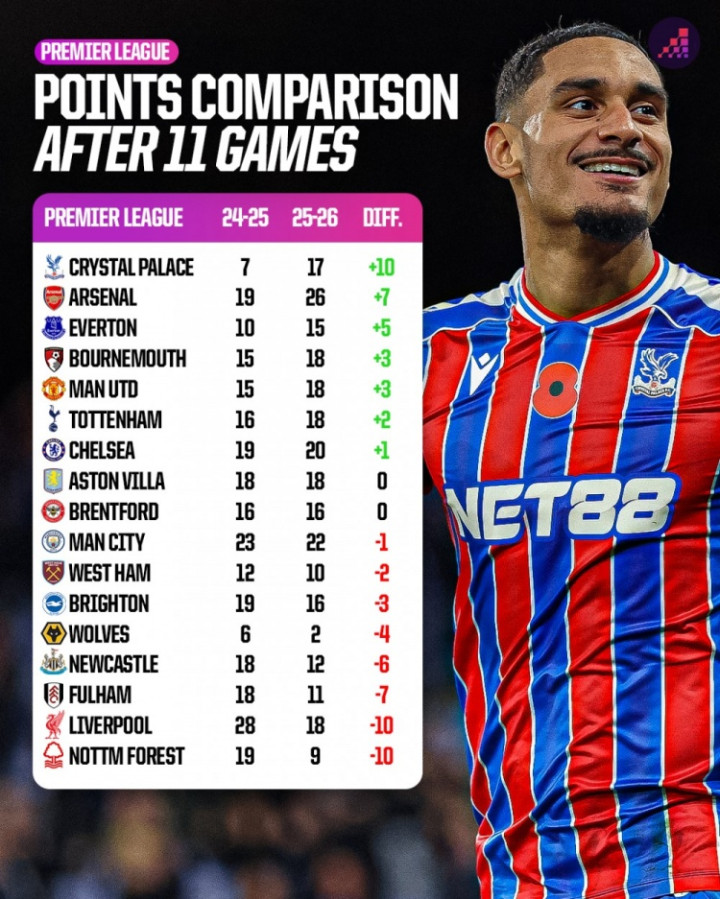 November 14th Opta counted the changes in points of the Premier League teams in the first 11 rounds of this season and the same period last season, and listed the list. Crystal Palace +10 points improved the most, Arsenal +7 points, and Liverpool -10 points.