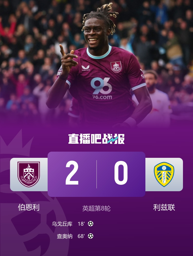 October 19 News At 22:00 on October 18, in the 8th round of the Premier League, Burnley faced Leeds United at Turf Moor Stadium. In the first half, Walker assisted Ugo Chukwu to score! After halftime, Burnley is 1-0 Leeds United! In the second half, Chaona scored a goal to expand the score advantage. Leeds United made substitutions and adjustments to strengthen the attack, but failed to score! At the end of the game, Burnley 2-0 Leeds United!