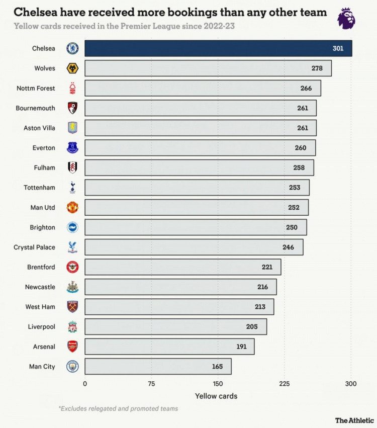 Since the 2022-23 season, Chelsea has received 301 yellow cards in the Premier League, far more than any other team.