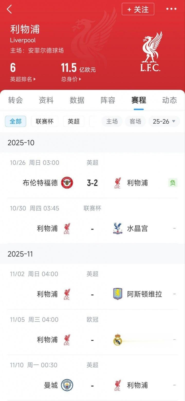 October 26th: Liverpool lost 2-3 to Brentford in the 9th round of the Premier League and suffered a fourth consecutive defeat in the Premier League.