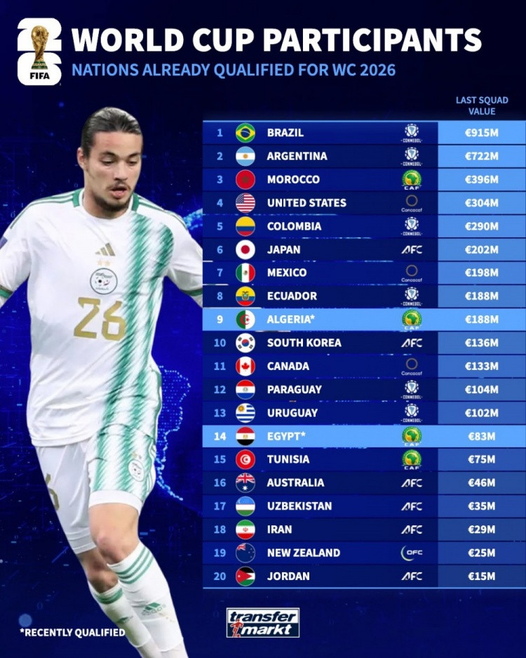 October 10th: The German transfer market calculated the value of players from teams that have qualified for the 2026 World Cup (players in the previous list) and listed them. Brazil ranked first, followed by Argentina.