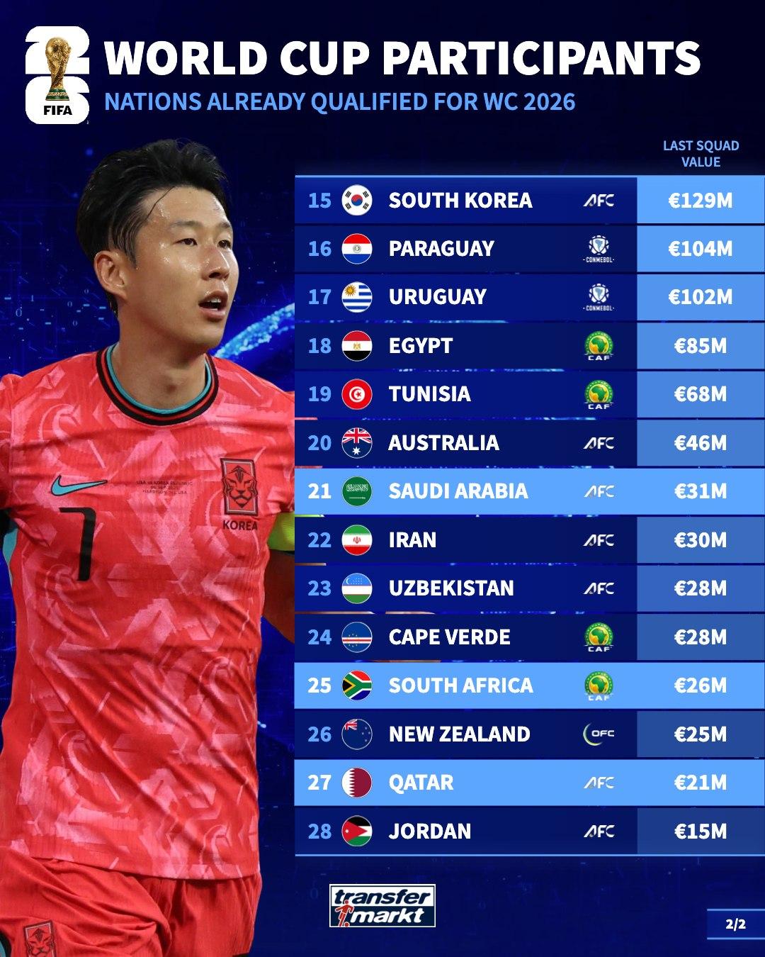 According to German transfer market statistics, a total of 28 national teams have so far confirmed to enter the 2026 World Cup finals. Their total value ranking (in euros) is as follows: