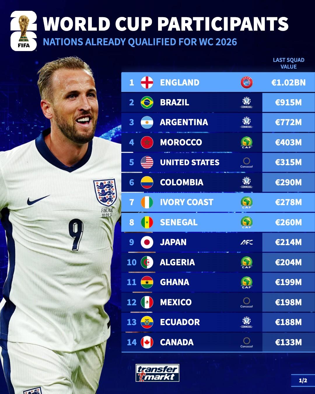 Value list of teams that have qualified for the World Cup: England leads the way with 1.02 billion, followed by the South American duo